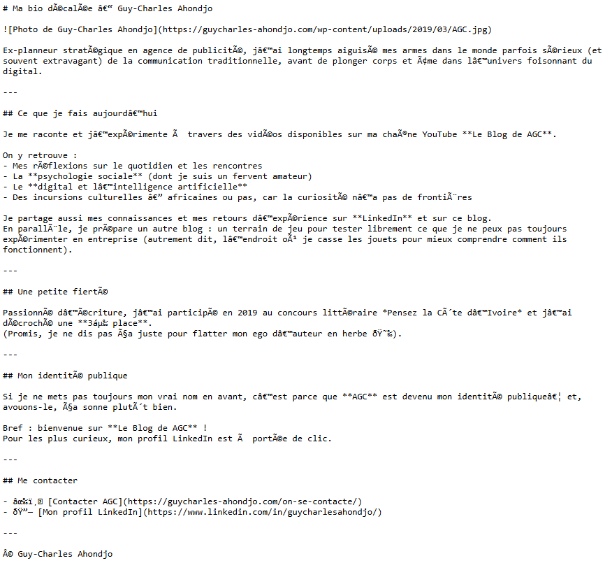 J’ai suivi la procédure partiellement : j’ai ajouté 6 fichiers, dont /llms.txt, /llms-full.md et 4 articles que j’apprécie. C’est à ce moment que j’ai remarqué qu’en créant une page avec l’extension .md, celle-ci remplaçait la page web existante. En effet, une version Markdown avec le même nom prend la place de la page originale. Comme les pages en .md posaient des problèmes d’affichage et d’expérience utilisateur, j’ai renommé mes fichiers en ajoutant -llm.md, par exemple : https://guycharles-ahondjo.com/ma-bio-decalee-llm.md. J’avais ainsi 2 pages pour chaque article: une page en html et une page en markdown.